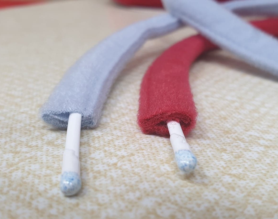 Den slags bøjler, vi anvender hos Miss Mary, har en afrundet ende med plastbelægning, så de ikke skærer sig ud gennem materialet. For at forhindre at bøjlen ikke trækkes forkert ind, er de bøjler vi anvender farvemarkerede, så syersken kan se hvilken del, der skal være mellem brysterne og hvilken, der skal være mod armhulen..
