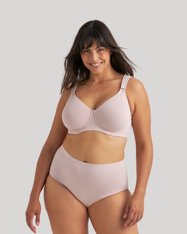 Organic Cotton-kollektionen omfatter vores første formstøbte bomulds-BH. Både formstøbte BH'er og bomulds-BH'er er et Miss Mary-varemærke, men det er første gang, vi har kombineret deres styrker i ét og samme produkt. Dette er en stilfuld og behagelig BH, der er virkelig behagelig. Skålene er ikke vatterede og har en rund form uden sømme, så BH'en ikke kan ses under tøjet. Både den brede ryg og siderne giver en god stabilitet, mens de brede, vatterede stropper giver en ekstra komfort.